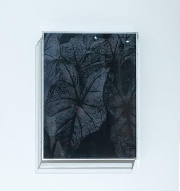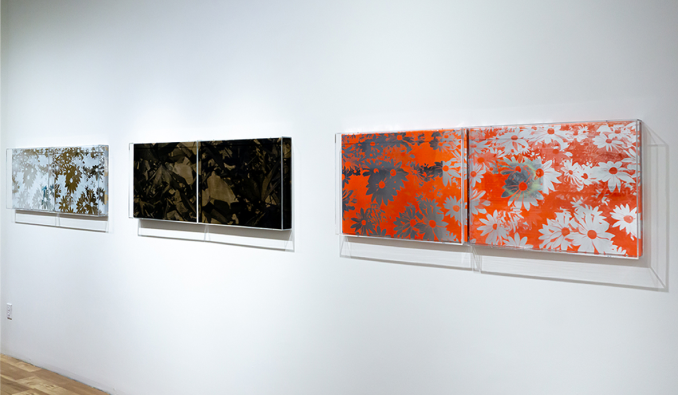 Untitled (White Flowers Diptych), 2021, white UV acrylic gold spraypaint on reflective mylar, on panel, framed in plexiglass, 18 x 48 in.
