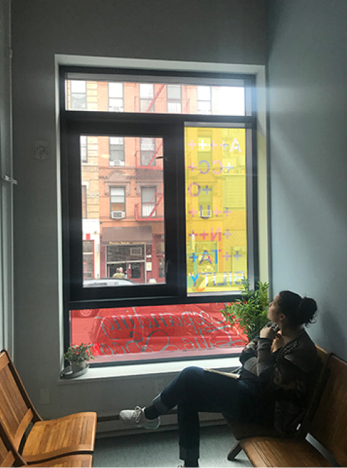 Installation work in the F.A.B building: Expanding The Scope (window film) and Signal Boost (plank on shelving)