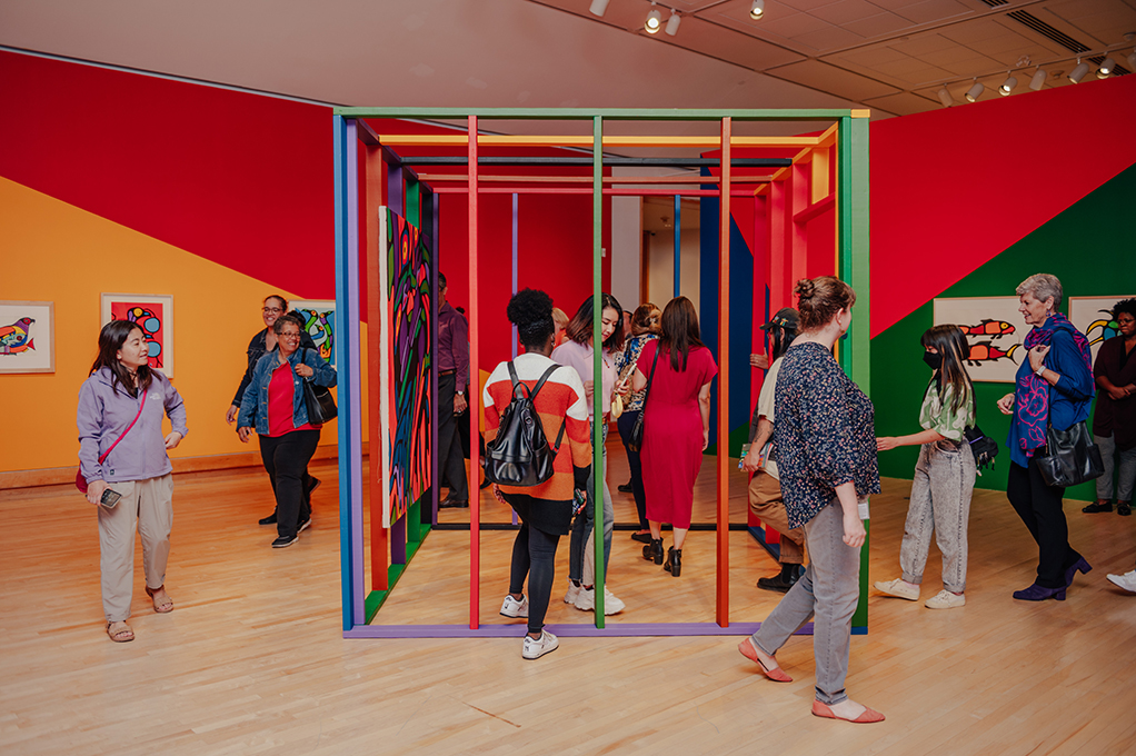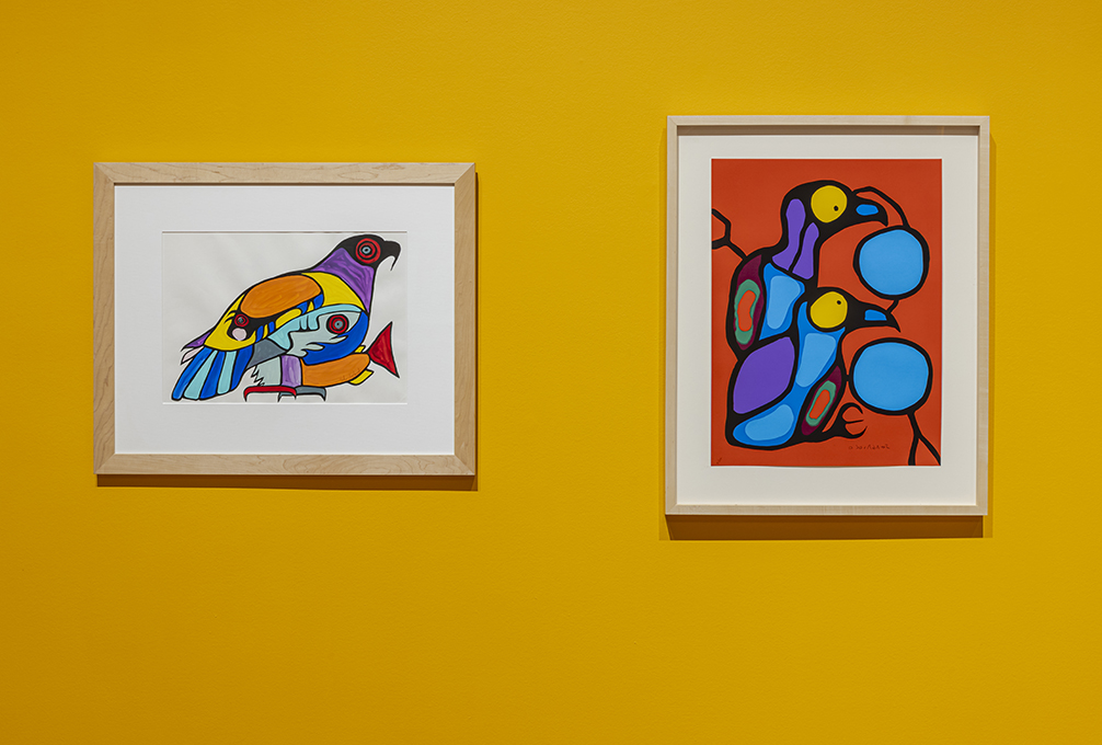 The painting Woodland Boogie Woogie 6 exemplifies their collaborative work, which sees each artist taking turns to contribute to the large colorful abstract painting included in this exhibition. Their inspiration, and the name of their series, stems from the Woodland School of Art. The Woodland School’s approach was founded by Norval Morrisseau of the Anishinaabe Nation and taken up by other First Nation artists from the Great Lakes Region in the 1960s and 1970s. The style merged traditional imagery with elements of modern art and is defined by bold saturated colours and black curvilinear outlines. Focusing on the key aspects of the style, NADI abstracts the iconic colours and forms used by the Woodland School, in order to expand the visual language and continue the cultural conversation.